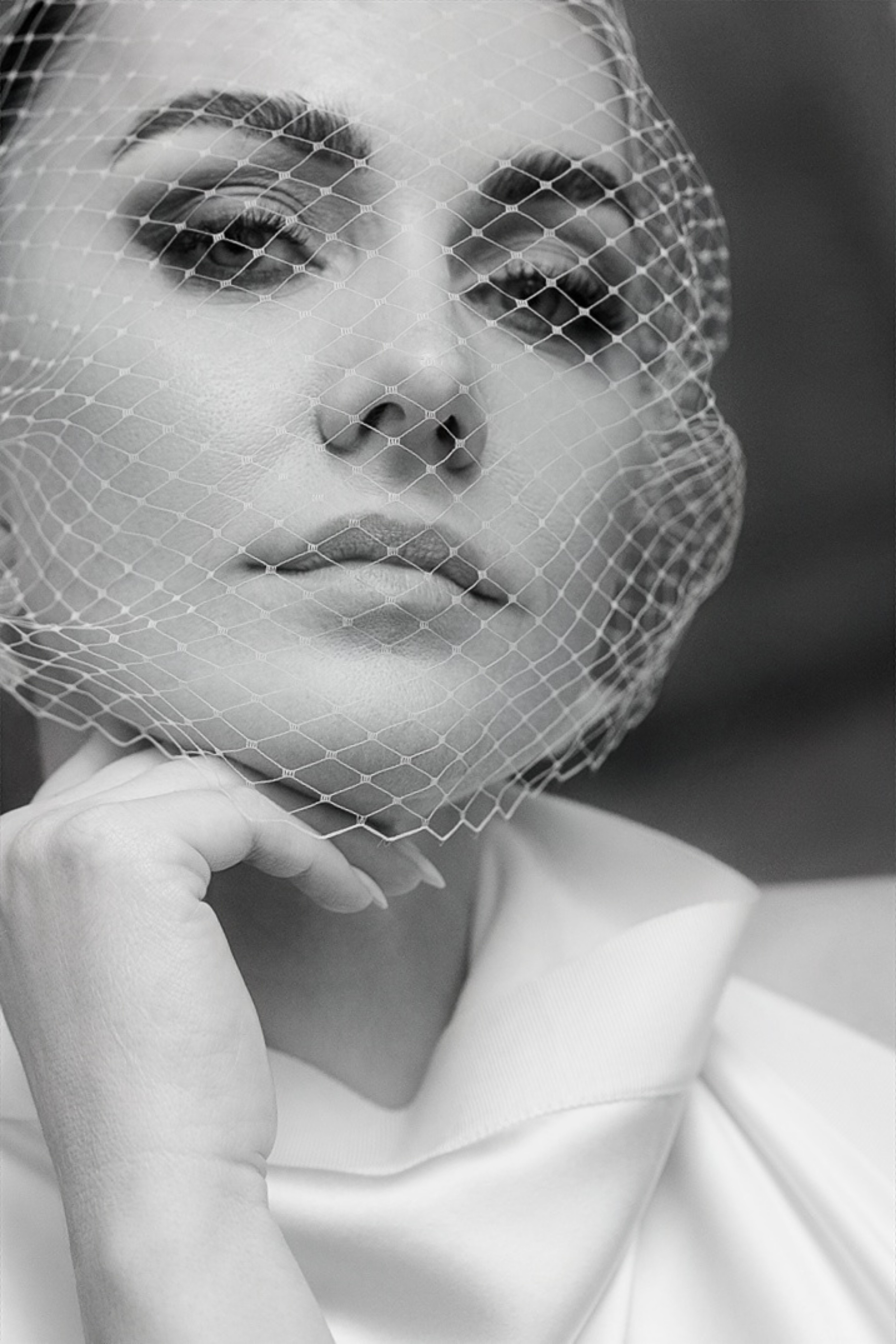 What birdcage veils do to a photograph is remarkable. They add instant mystique. Eyes behind net, a half-visible smile, the geometry of the netting against skin. These are images with mood and character, and they photograph beautifully in black and white.