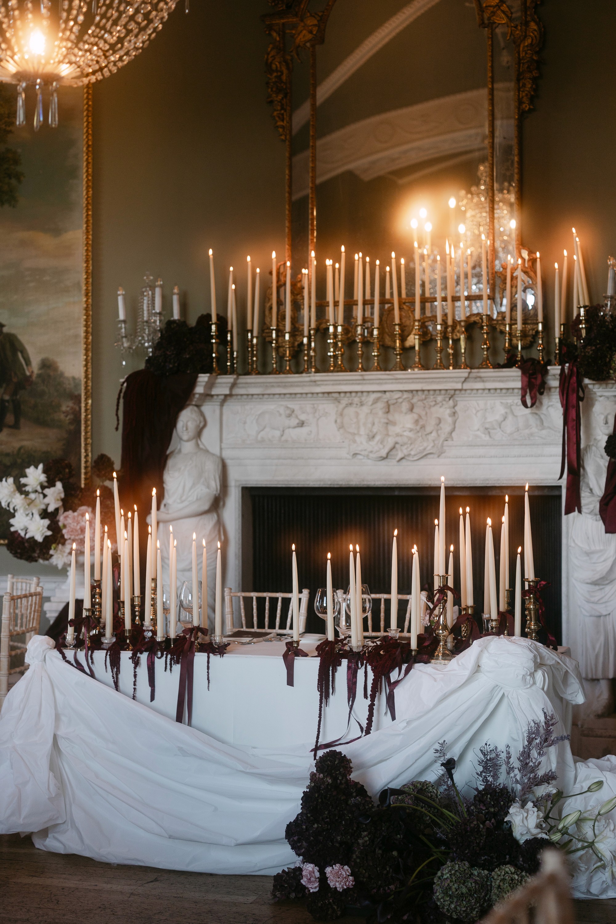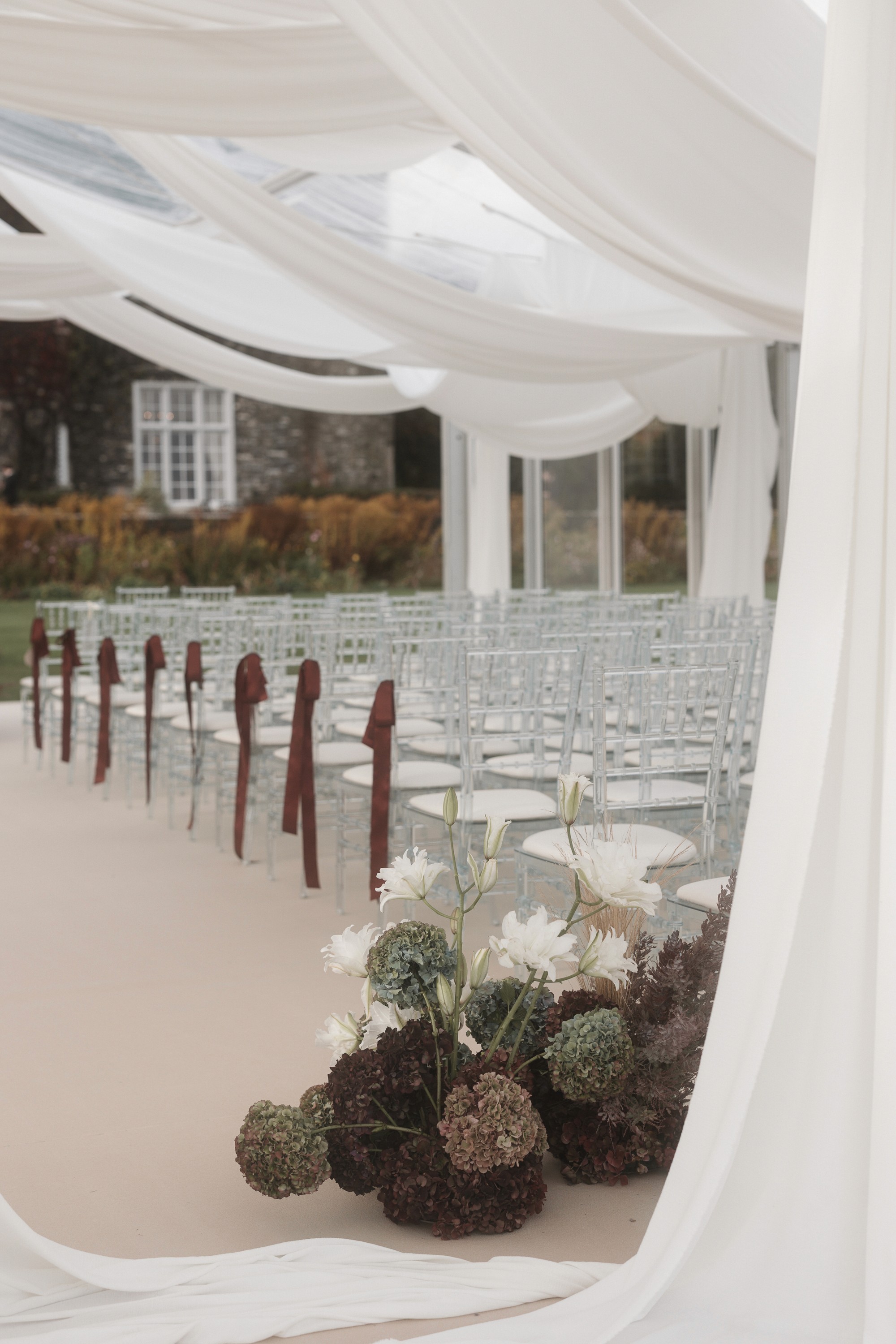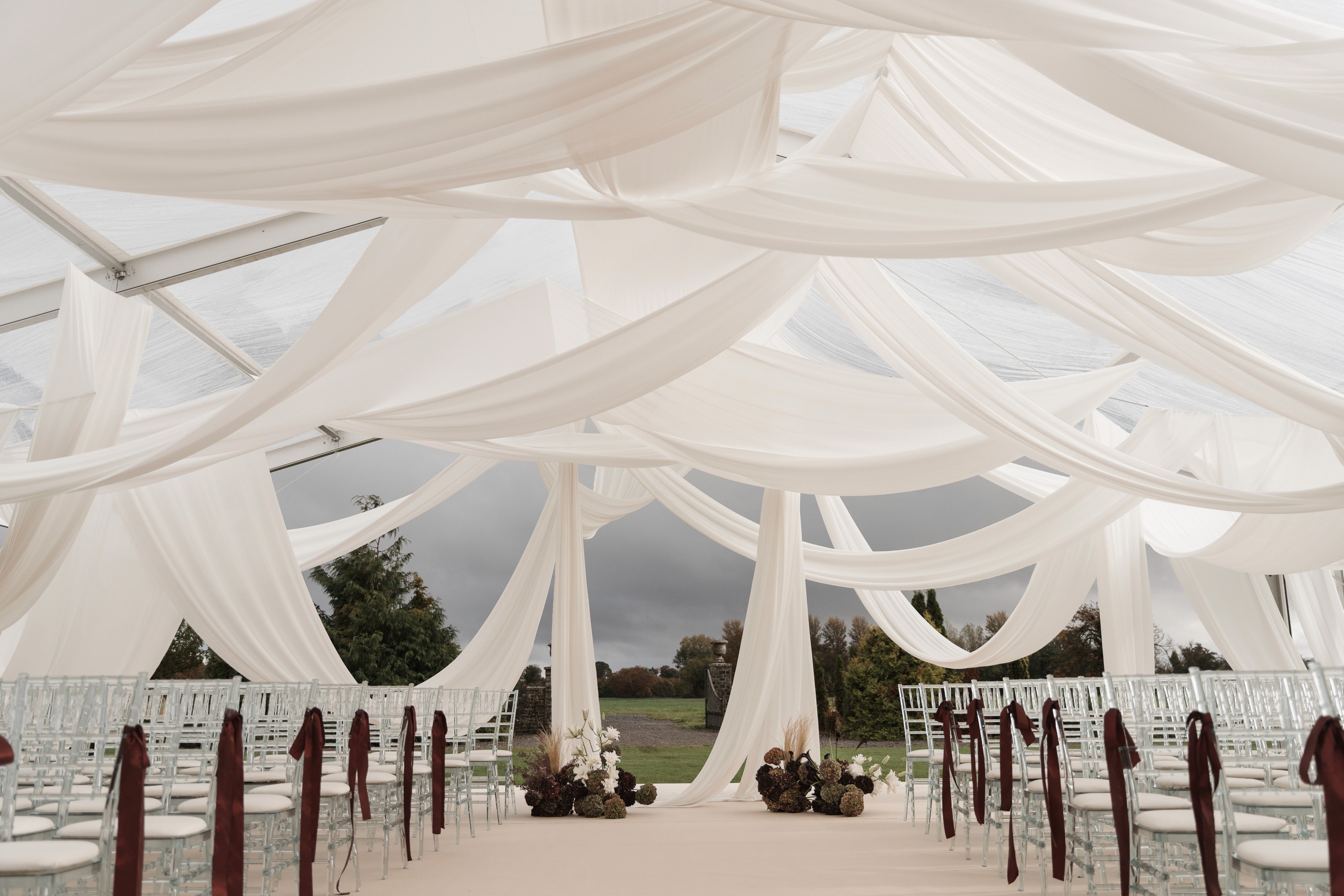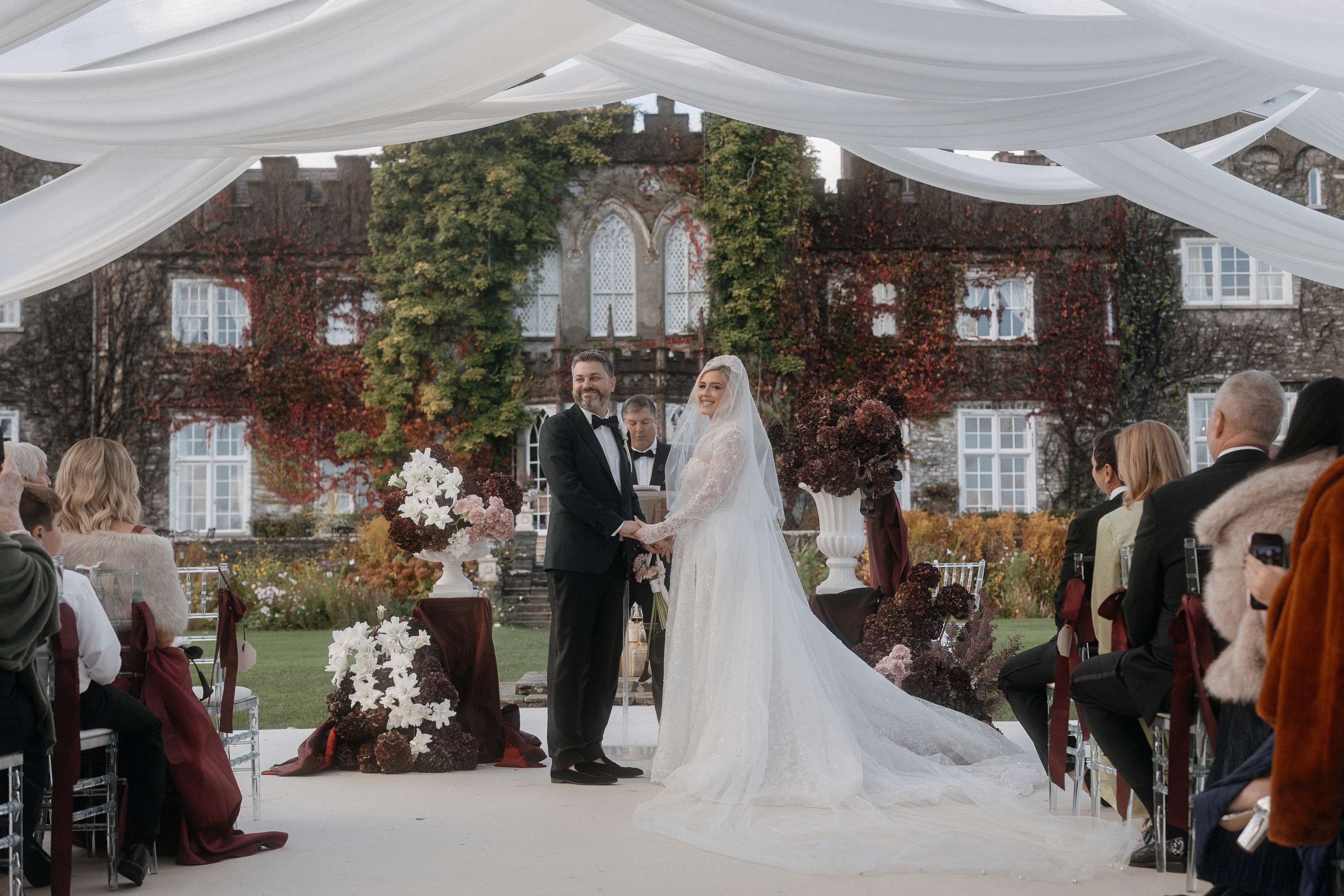 Draping and florals reshaped the ceremony space, creating warmth and depth while maintaining the integrity of the castle, an environment that felt immersive and layered.