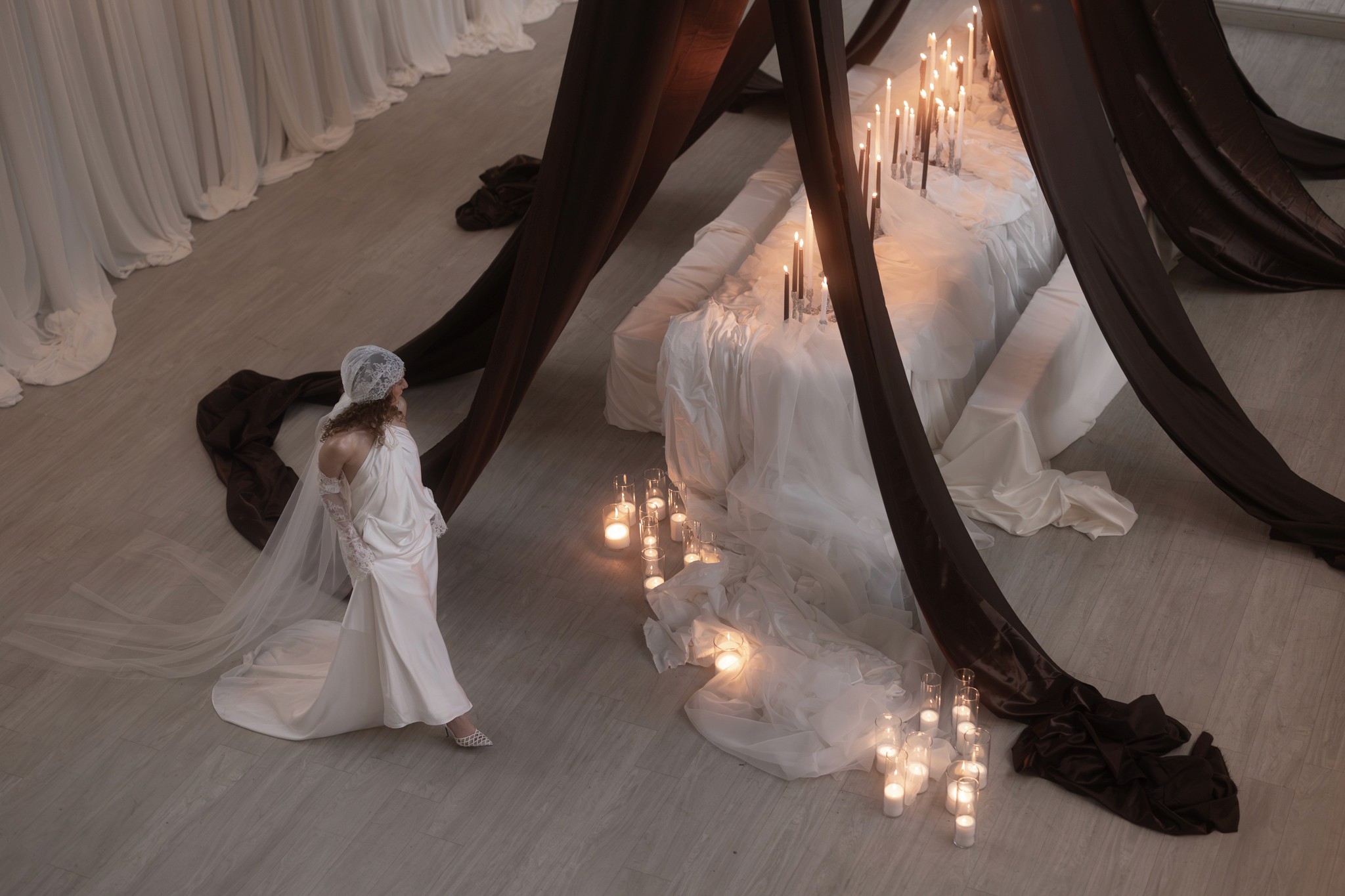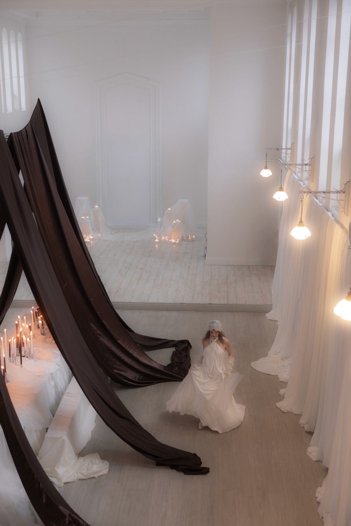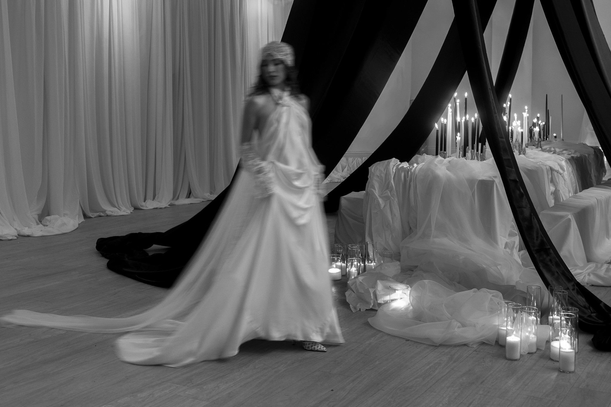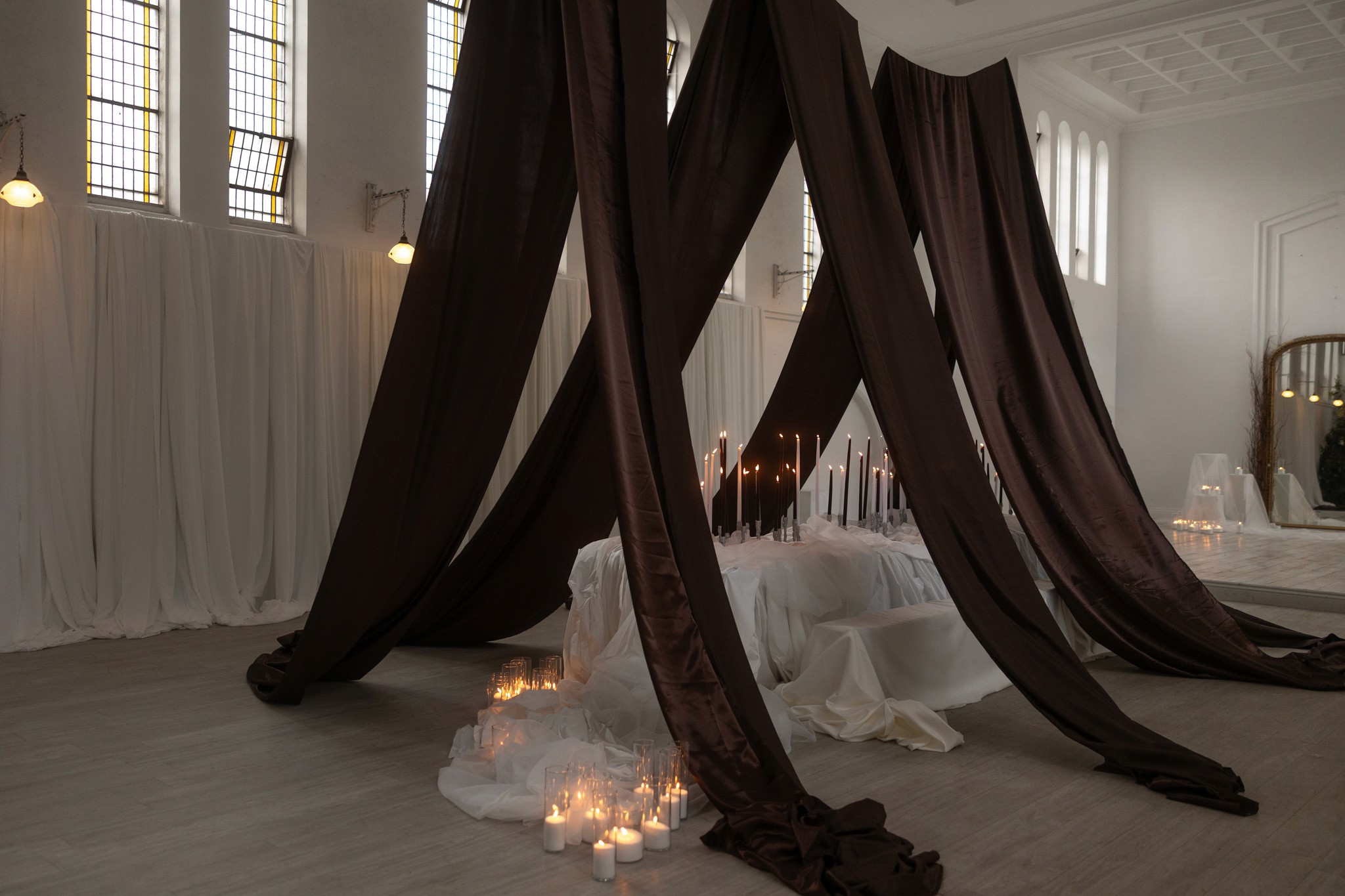 The space she created was extraordinary. Yards of fabric pooled across the floor, black and white silk in tension with each other, dramatic and soft at once. Clusters of candles sat low among the gathered tulle, their light catching the folds and making everything feel like it was breathing.