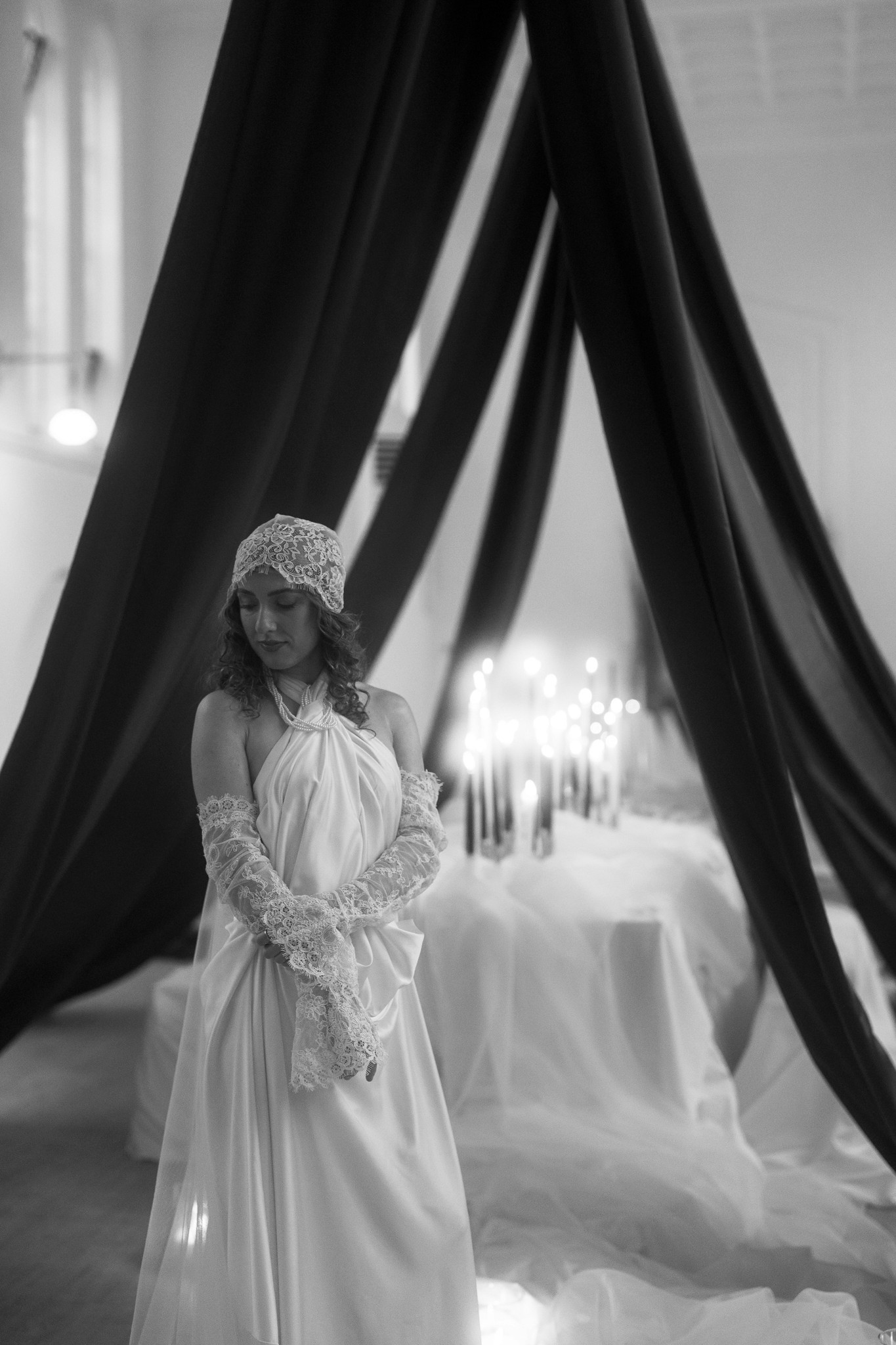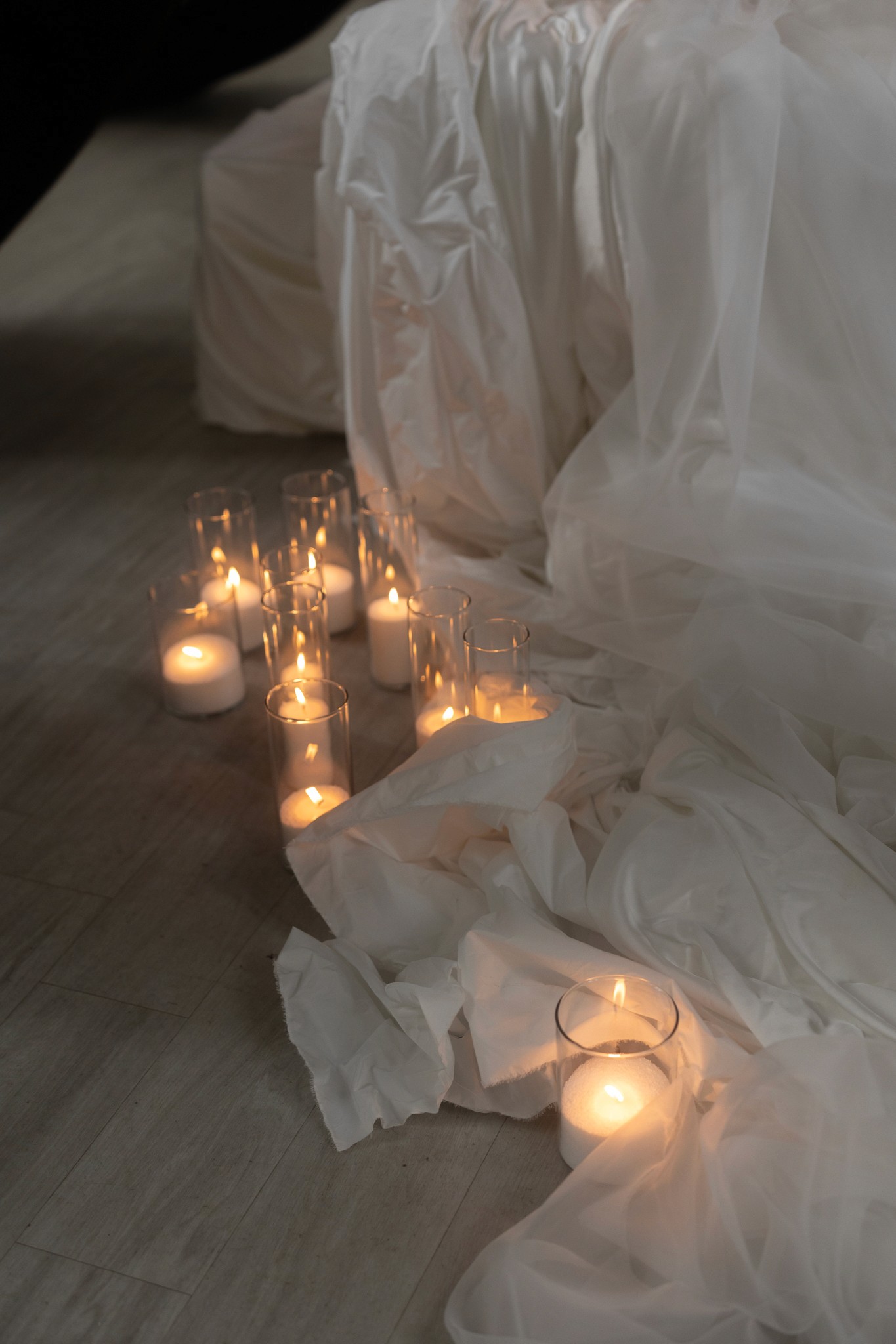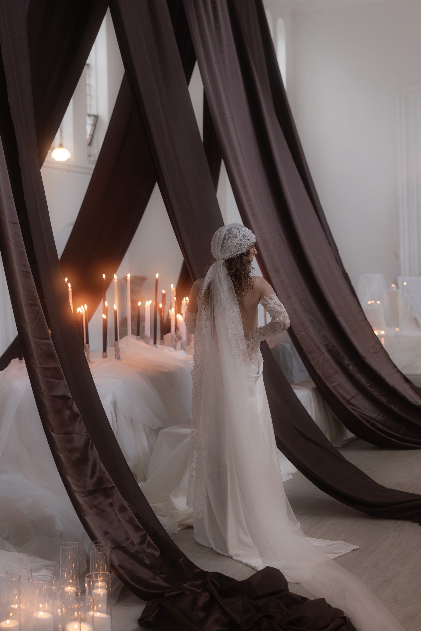 The space she created was extraordinary. Yards of fabric pooled across the floor, black and white silk in tension with each other, dramatic and soft at once. Clusters of candles sat low among the gathered tulle, their light catching the folds and making everything feel like it was breathing.