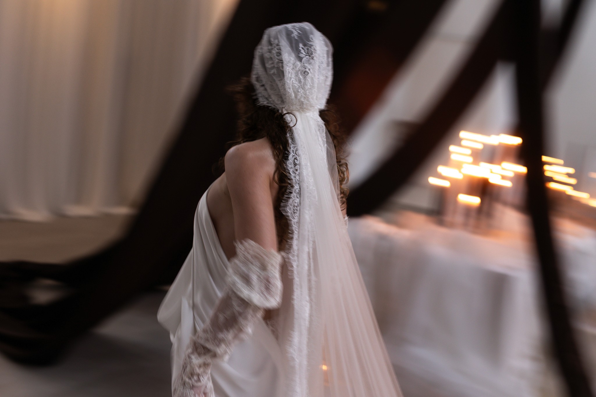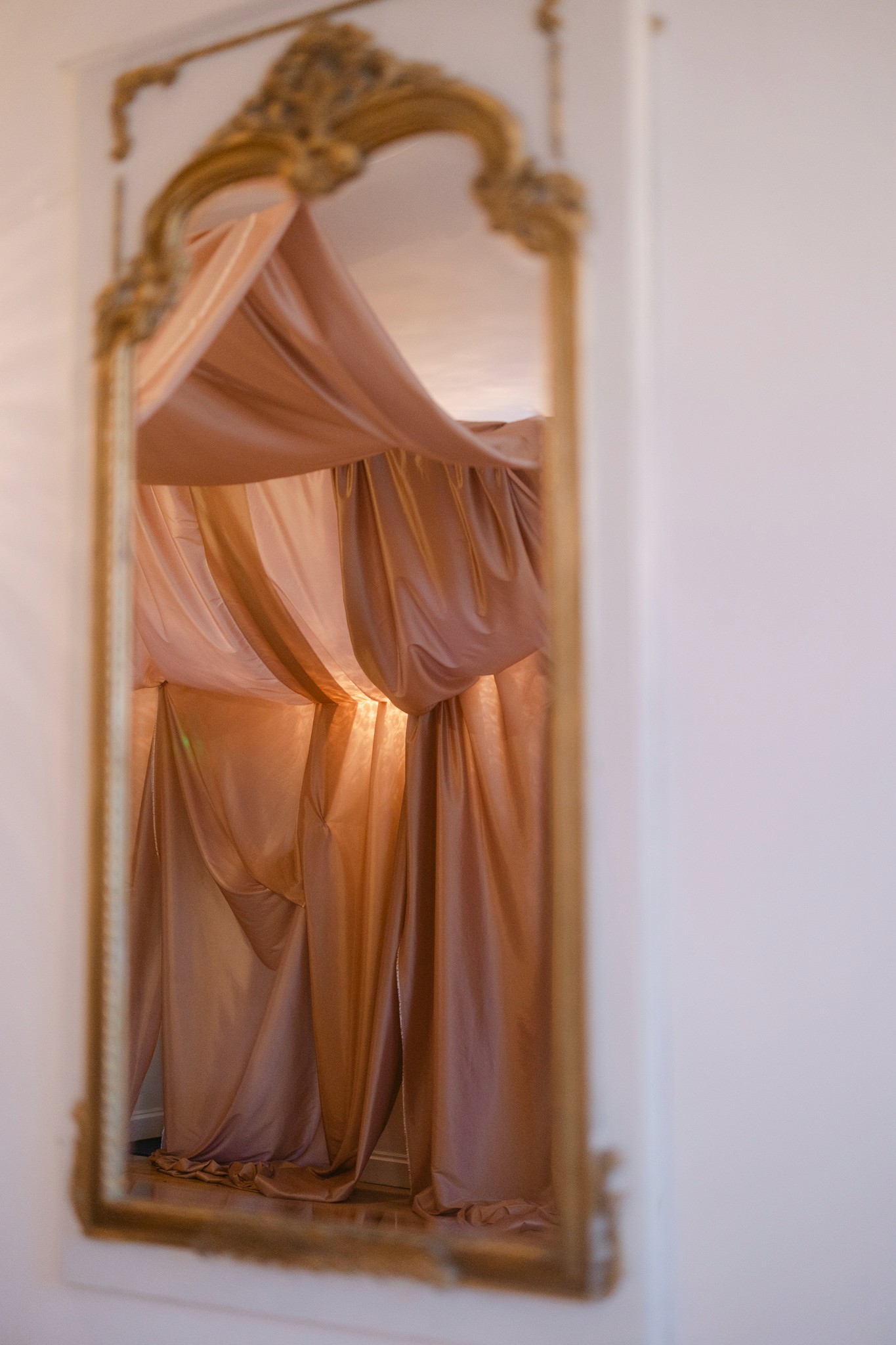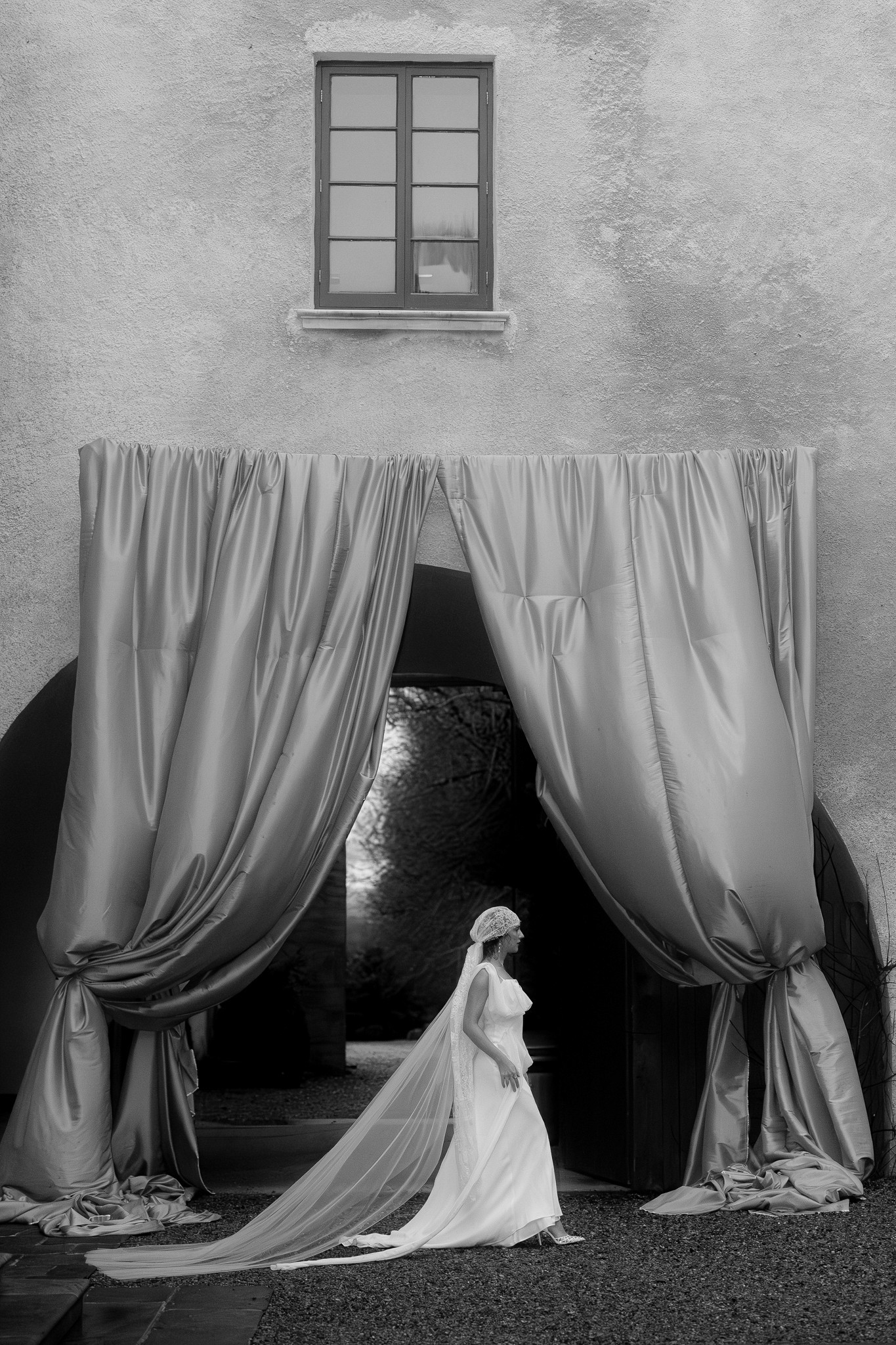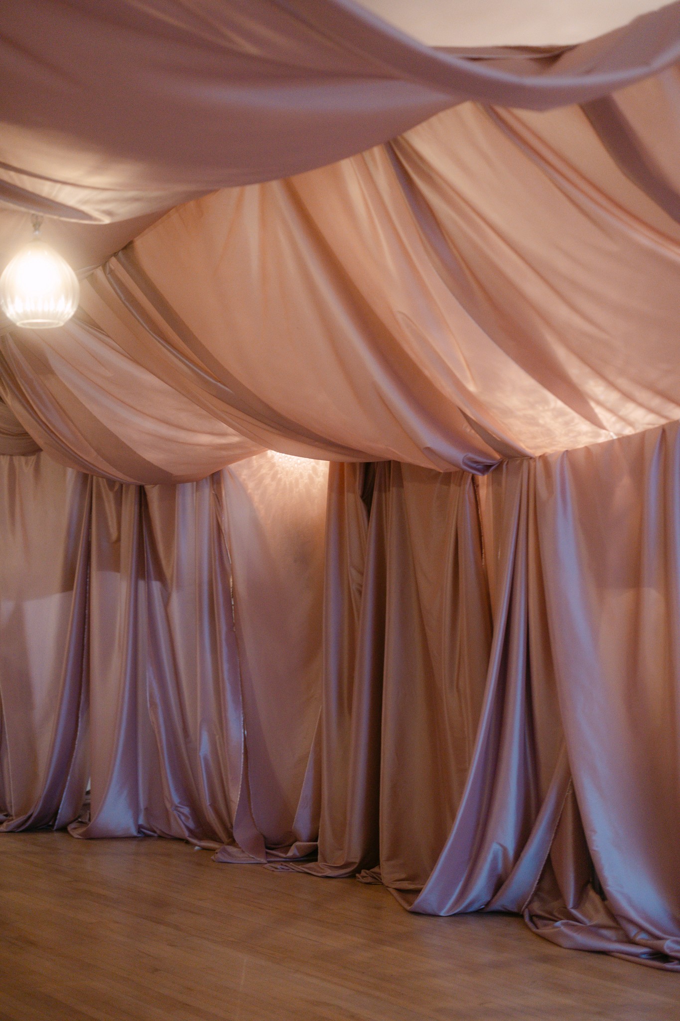 The space she created was extraordinary. Yards of fabric pooled across the floor, black and white silk in tension with each other, dramatic and soft at once. Clusters of candles sat low among the gathered tulle, their light catching the folds and making everything feel like it was breathing.