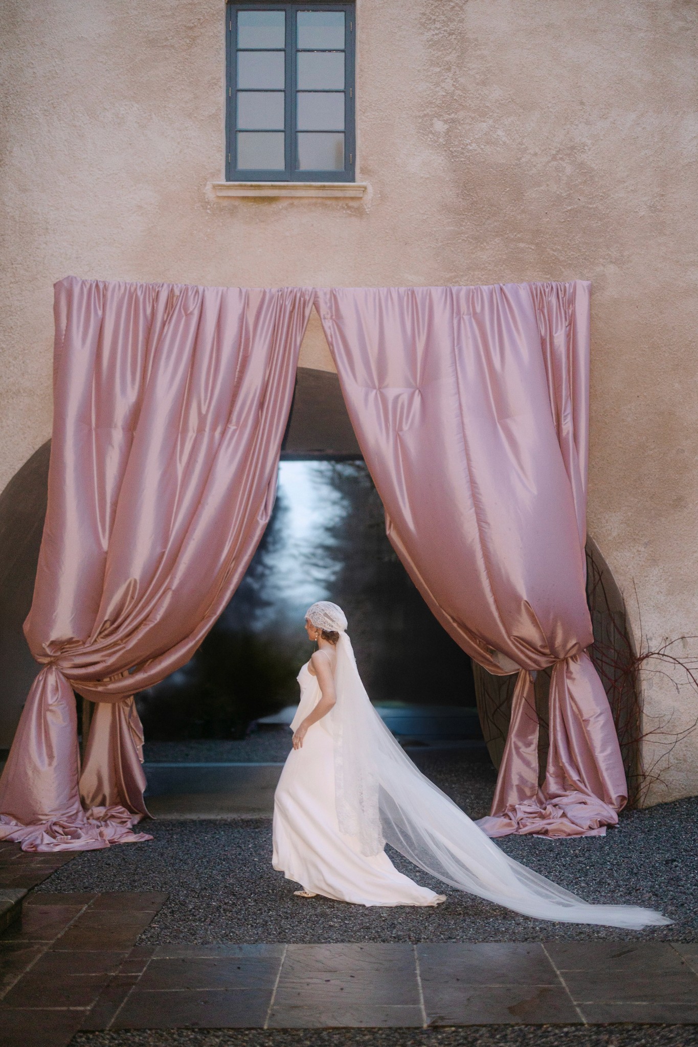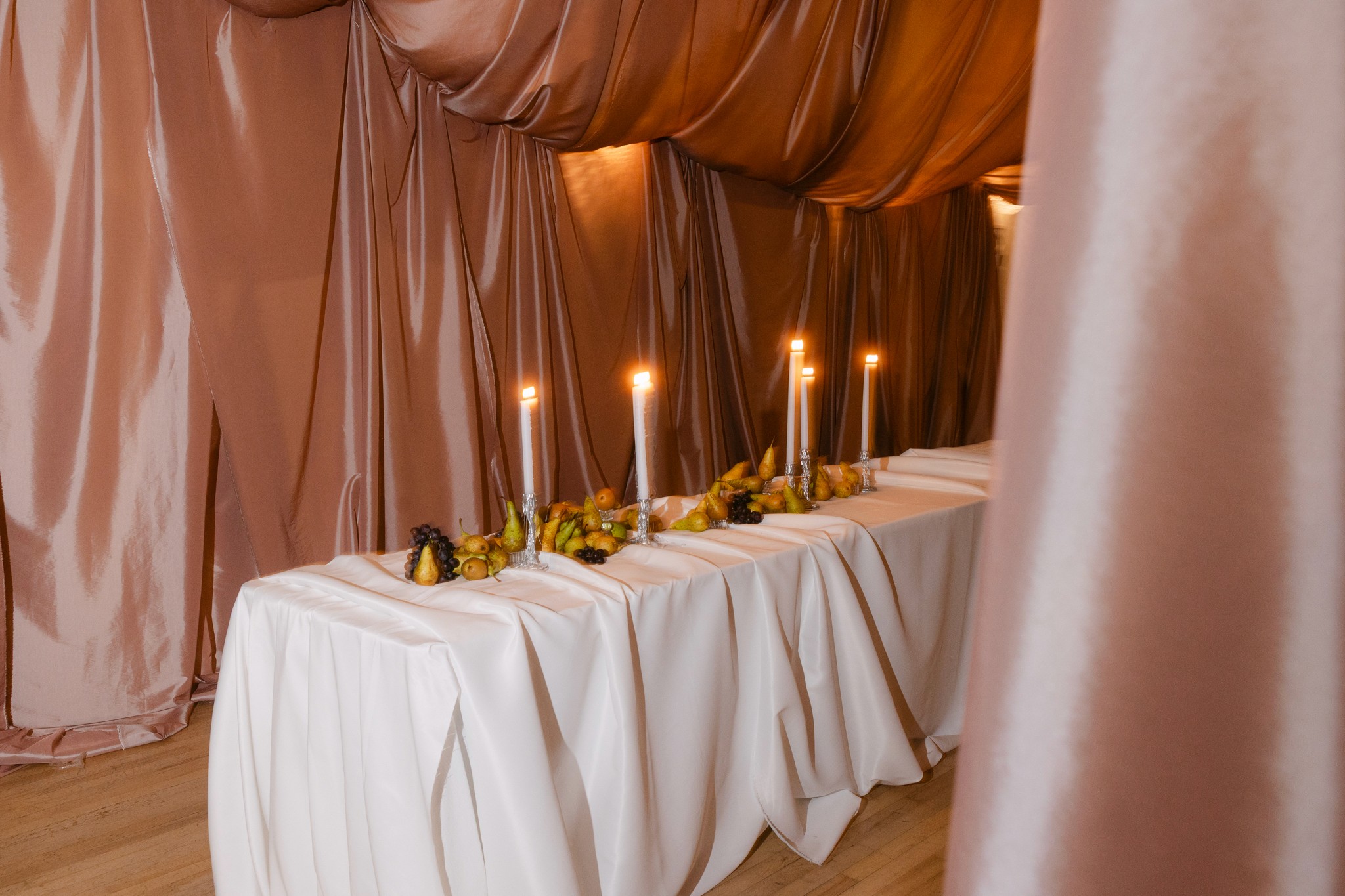 The tablescape carried that same intention, dusty rose draping overhead, pillar candles rising between scattered pears and dark grapes, the whole thing feeling closer to a painting than a wedding table. Every detail had been considered, and it showed.