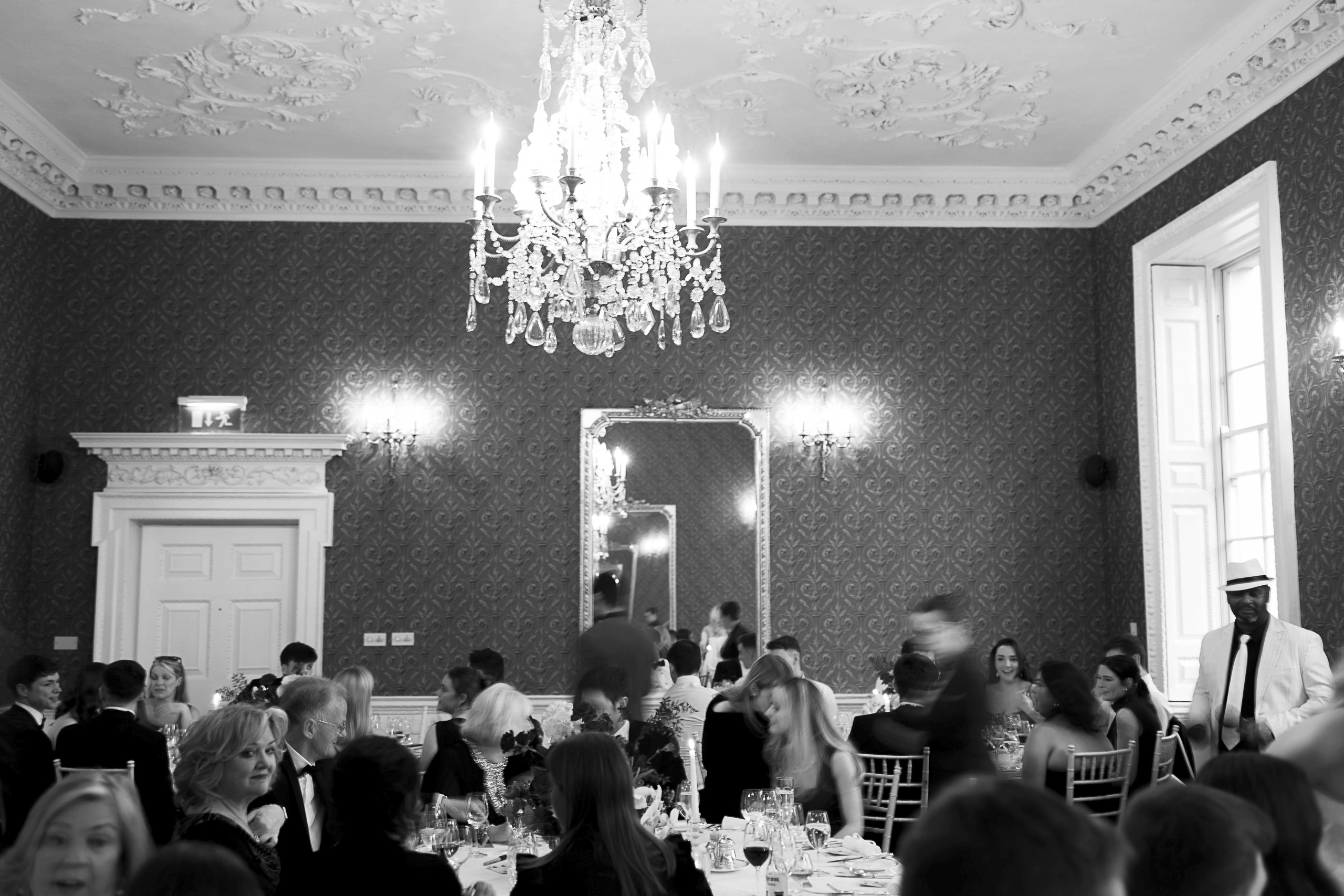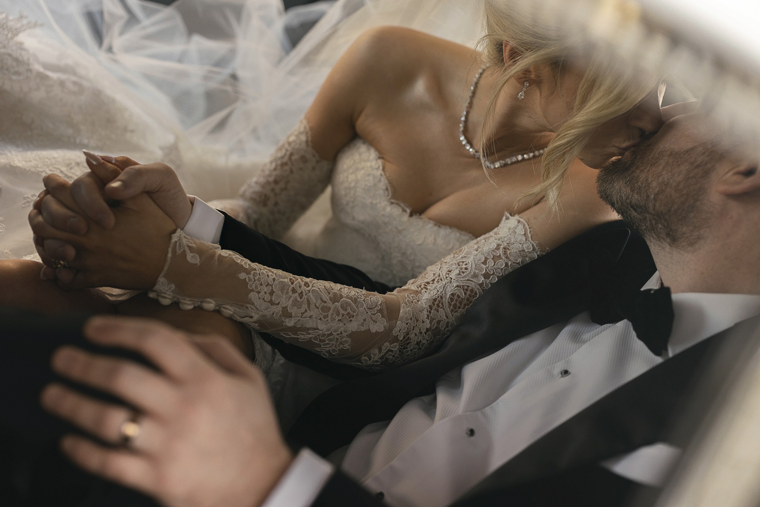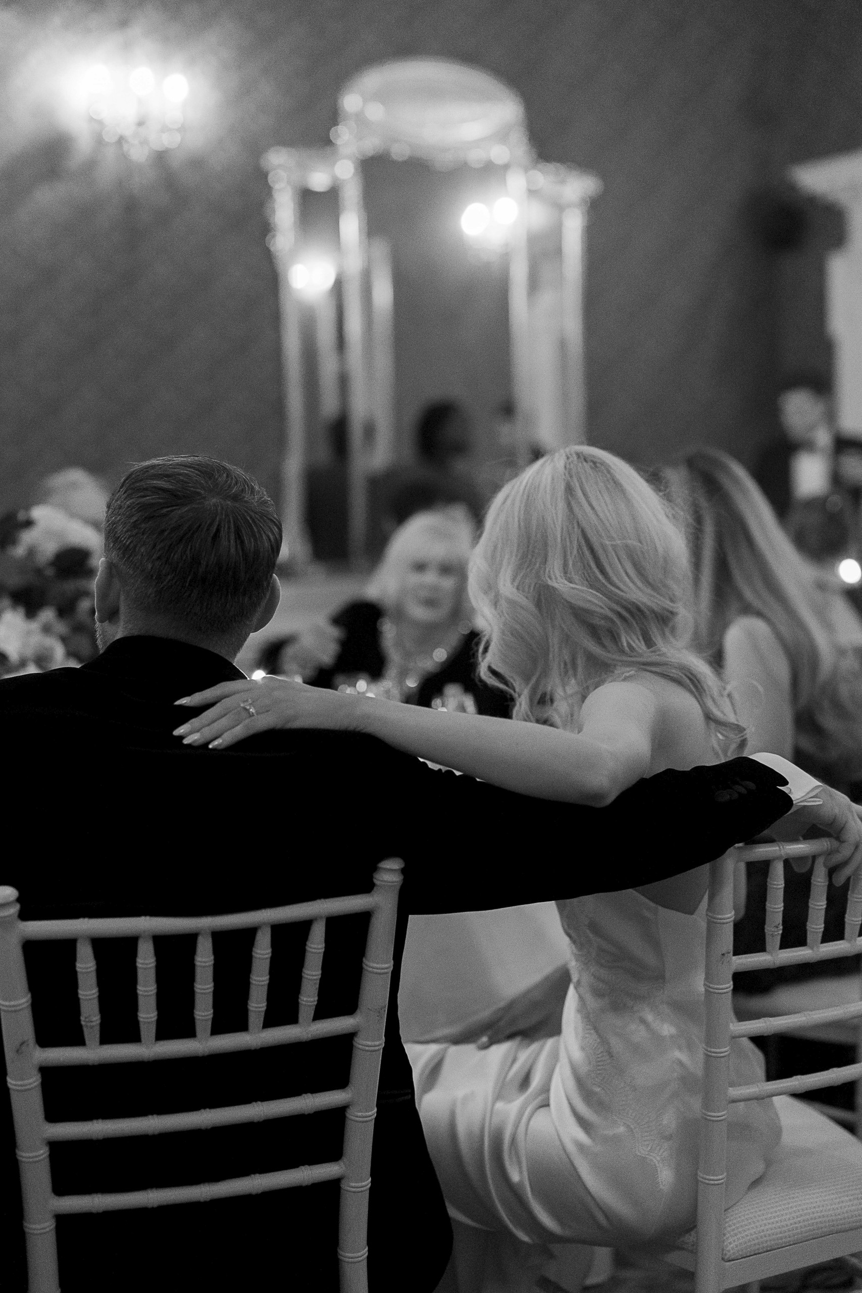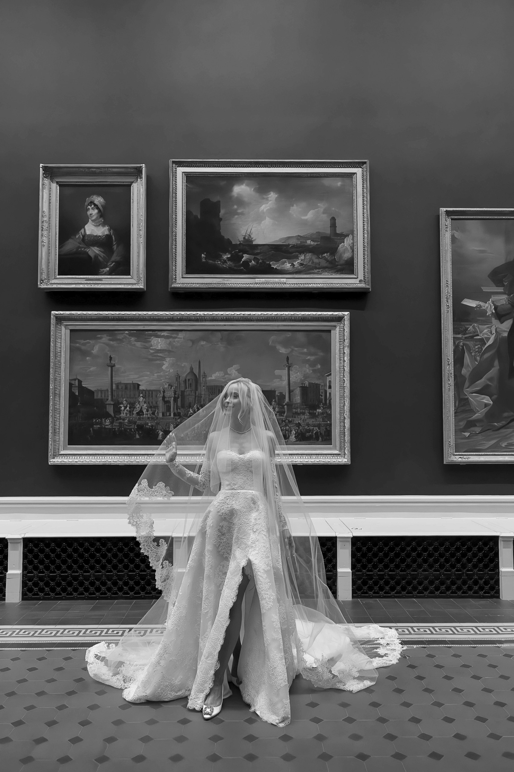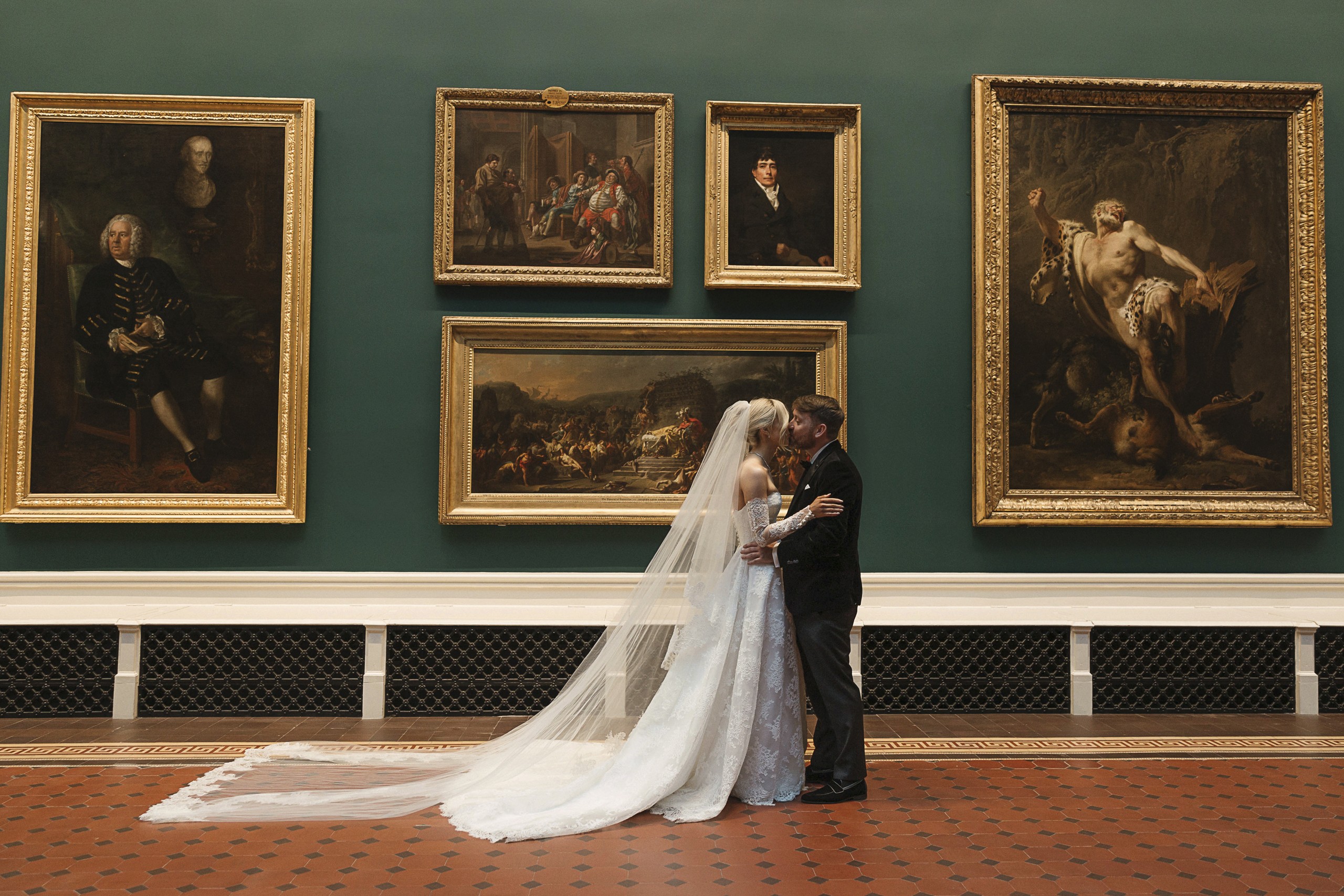 Their first look happened in one of those pockets of light that you hope for and cannot plan. Helena in her Suzanne Neville gown, the gallery hushed around them, and a moment between two people that needed nothing added to it.